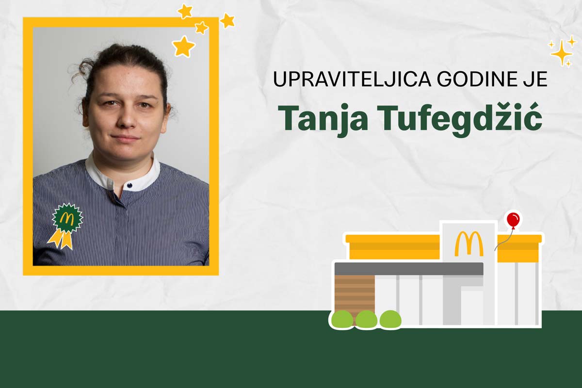 Naša Tanja Tufegdžić iz McDonald’sa Vrapče proglašena je upraviteljicom 2023. godine. Vrijedno priznanje stiglo je kao potvrda njezinom iznimnom vodstvu, neumornoj posvećenosti timu te brizi za naše goste. Mi smo već odavno upoznati koliko truda, rada i motivacije stoji iza njezinog uspjeha , a vjerujemo da to znaš i ti iz svog iskustva ako si ikada posjetio naš restoran u Vrapču. Ako slučajno nisi, sad imaš razlog više.