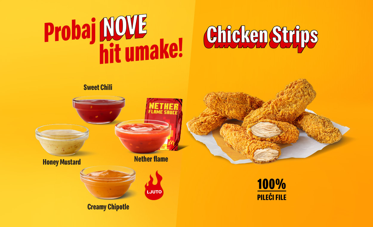 Za sve ljubitelje klasičnih kombinacija, tu je Honey Mustard umak na bazi senfa i meda uz dodatak začina. Ako si pak ljubitelj pikantnih okusa, isprobaj slatko-ljutu kombinaciju Sweet Chili umaka na bazi chili papričica i češnjaka uz dodatak začina ili pak Creamy Chipotle umak na bazi vrhnja i Chipotle paprika uz dodatak začina. A tu je i Nether Flame, ljuti umak inspiriran popularnom videoigrom Minecraft, koji pikantni doživljaj podiže na potpuno novu razinu.