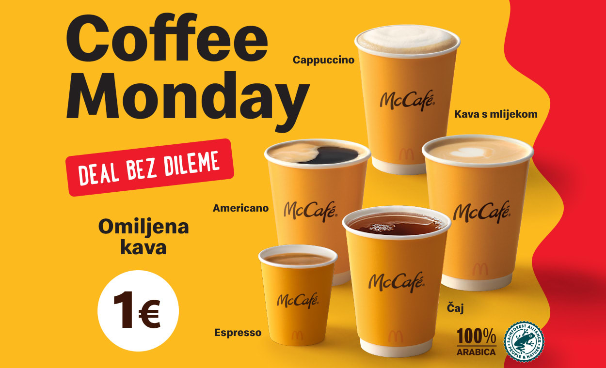 Proširili smo Coffee Monday ponudu i na čajeve! 🎉 Od sada, bez obzira piješ li kavu ili čaj, svakog ponedjeljka navrati u McDonald’s i razveseli se svojim omiljenim napitkom za samo 1 euro.
