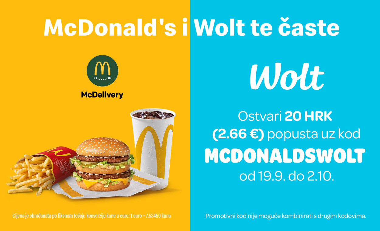 Od danas uz svaku narudžbu možeš iskoristiti MCDONALDSWOLT kod i ostvariti 20 kuna (2.66€) popusta.