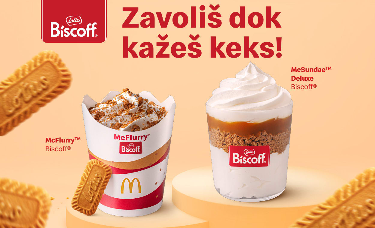 Naše kremaste sladolede obogatili smo hrskavim komadićima popularnog belgijskog Lotus Biscoff keksa, poznatog po svom prepoznatljivom karameliziranom okusu. Spoj mliječnog sladoleda i hrskavih komadića Lotus Biscoff keksa pretvorili smo u savršen jesenski užitak: McFlurry Biscoff. Za još bogatiji doživljaj, tu je McSundae Deluxe Biscoff s dodatkom preljeva od karamele, Lotus Biscoff komadićima hrskavog keksa i laganim šlagom na vrhu.
