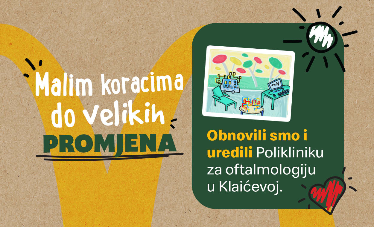 Nova Poliklinika za dječju oftalmologiju, koju smo pomogli urediti i opremiti modernim aparatom za dijagnostiku. Prethodnih smo godina kroz donacije pomogli urediti Odjel kirurgije glave i vrata te Odjel pedijatrije u kojima se sada nalazi šest McDonald’s soba.