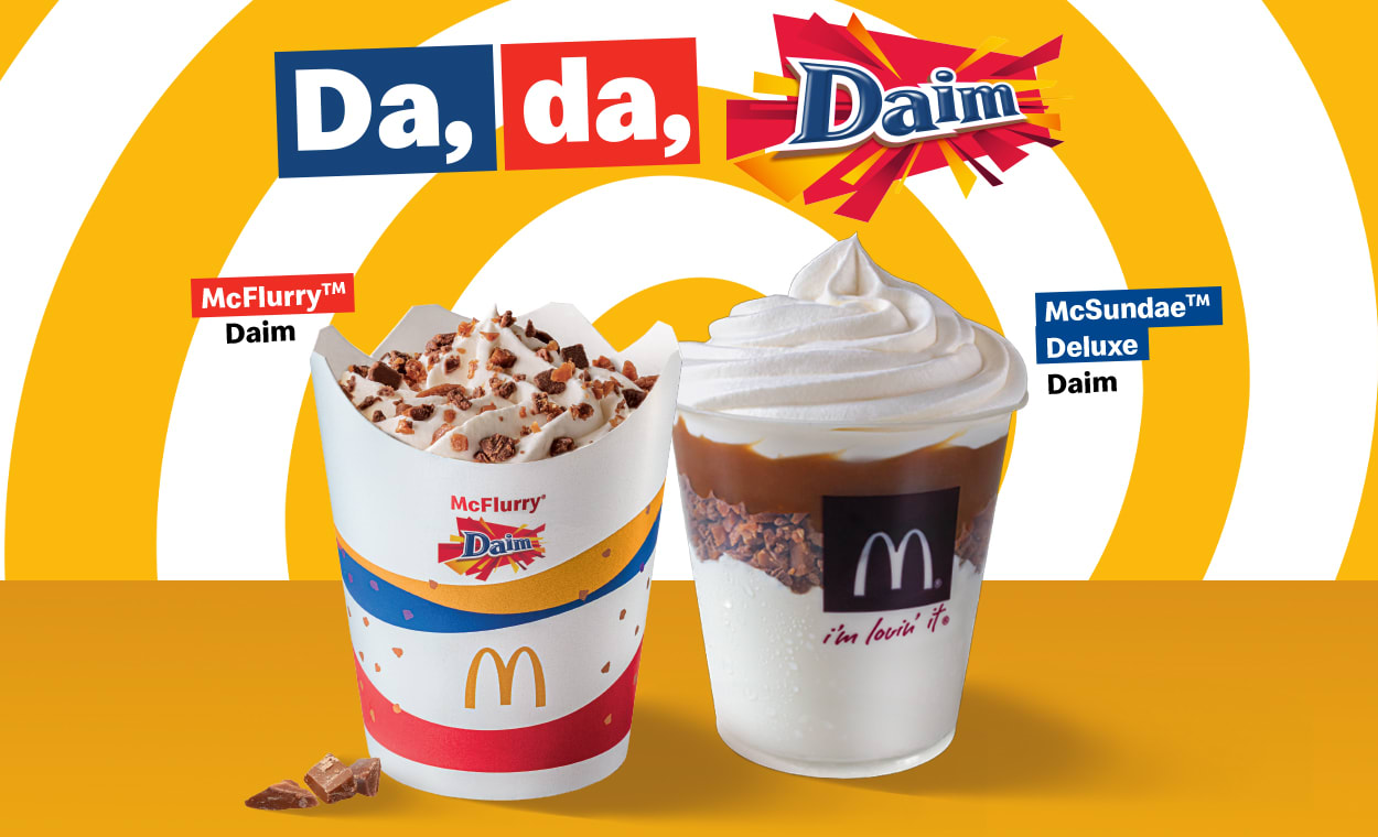 Spojili smo naš kremasti mliječni sladoled s komadićima Daim hrskave karamele u mliječnoj čokoladi u neodoljiv McFlurry Daim ledeni desert. Za još bogatiji okus tu je McSundae Deluxe Daim: ista savršena kombinacija sladoleda, komadića Daim hrskave karamele u mliječnoj čokoladi i preljeva od karamele, ali sa šlagom na vrhu.