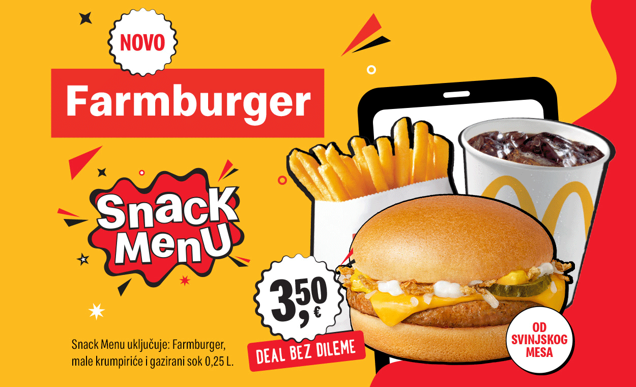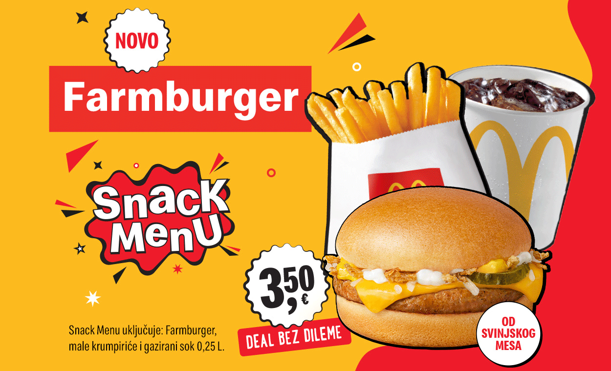Cheeseburger, Hamburger, Chikker, Snack wrap, Tasty Cheese ili Farmburger? Odluka je u potpunosti tvoja! Svoj najdraži mali sendvič upari s pićem od 0,25 l po izboru: Coca-Cola, Coca-Cola zero, Sprite zero, Fanta zero ili Fuzetea.