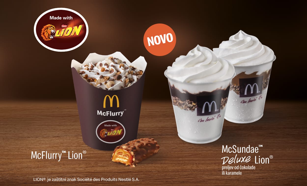 U kombinaciji s Nestlé Lion, tvoji omiljeni sladoledi McFlurry i McSundae Deluxe dobivaju novo ruho i još bogatiji okus koji će probuditi sva tvoja osjetila.
