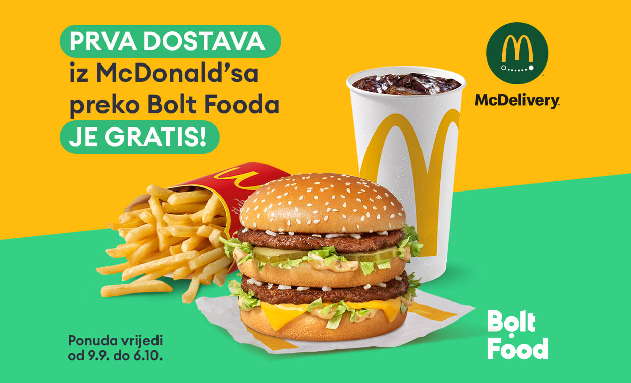 Bez obzira jesi li novi korisnik ili vjerni fan Bolt Food aplikacije, imamo sjajnu vijest za tebe. Od danas pa sve do 6. listopada, prva dostava iz McDonald's restorana je potpuno besplatna. 🚚✨