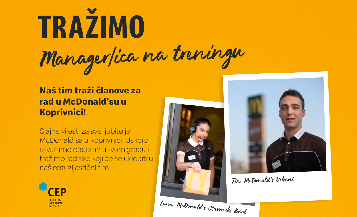Sjajne vijesti za sve ljubitelje McDonald'sa u Koprivnici! Uskoro otvaramo restoran u tvom gradu i tražimo radnike koji će se uklopiti u naš entuzijastični tim.