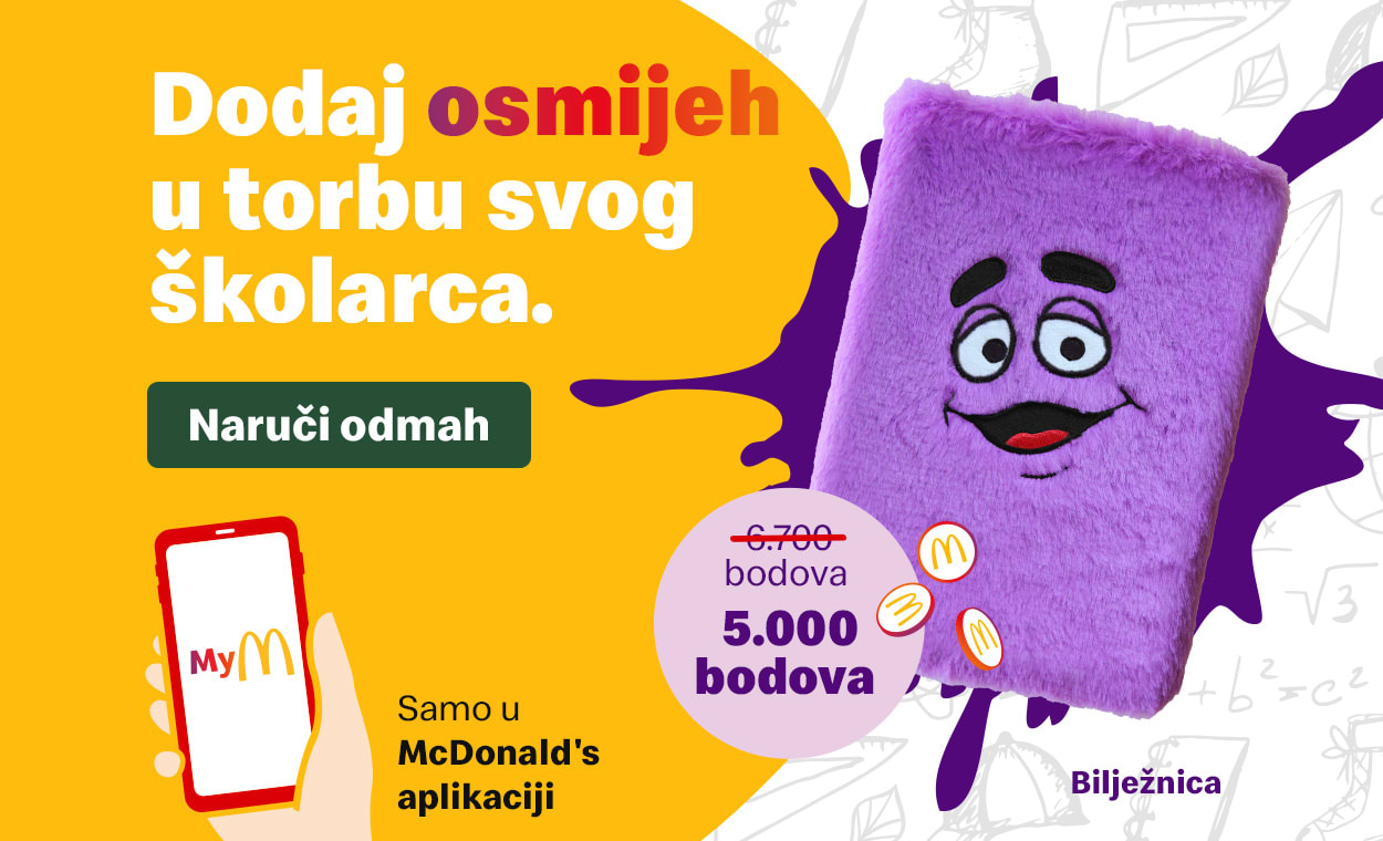 Ljubičasta Grimace bilježnica, savršena za zapisivanje svih važnih bilješki s nastave, sada može biti tvoja za samo 5000 bodova. Sve što trebaš napraviti je otvoriti našu aplikaciju, aktivirati nagradu i putem aplikacije odabrati restoran u kojem ćeš je preuzeti.