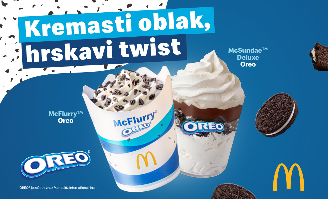 Naruči svoj McFlurry Oreo, kremasti mliječni sladoled uz komadiće hrskavog Oreo keksa ili McSundae Deluxe Oreo, kremasti mliječni sladoled s bogatim čokoladnim preljevom, hrskavim komadićima Oreo keksa i šlagom kao pravi šećer na kraju tvog sladolednog užitka. Koji god odabereš, ne možeš pogriješiti.