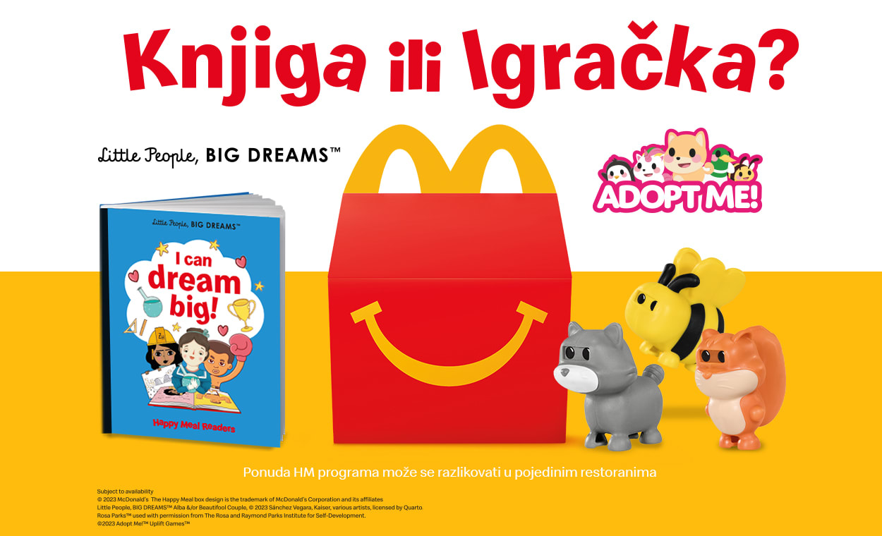 Ako vaši mališani vole životinje i sanjaju o novom ljubimcu, oduševit će ih novi Happy Meal koji donosi omiljene likove iz najpopularnije Roblox igre Adopt me!. Bilo da se radi o simpatičnom psiću, gracioznoj zebrici, hrabrom lavu ili veseloj vjeverici, neka vaše dijete odabere svog favorita među dvanaest igračaka izrađenih od ekološki prihvatljive plastike.