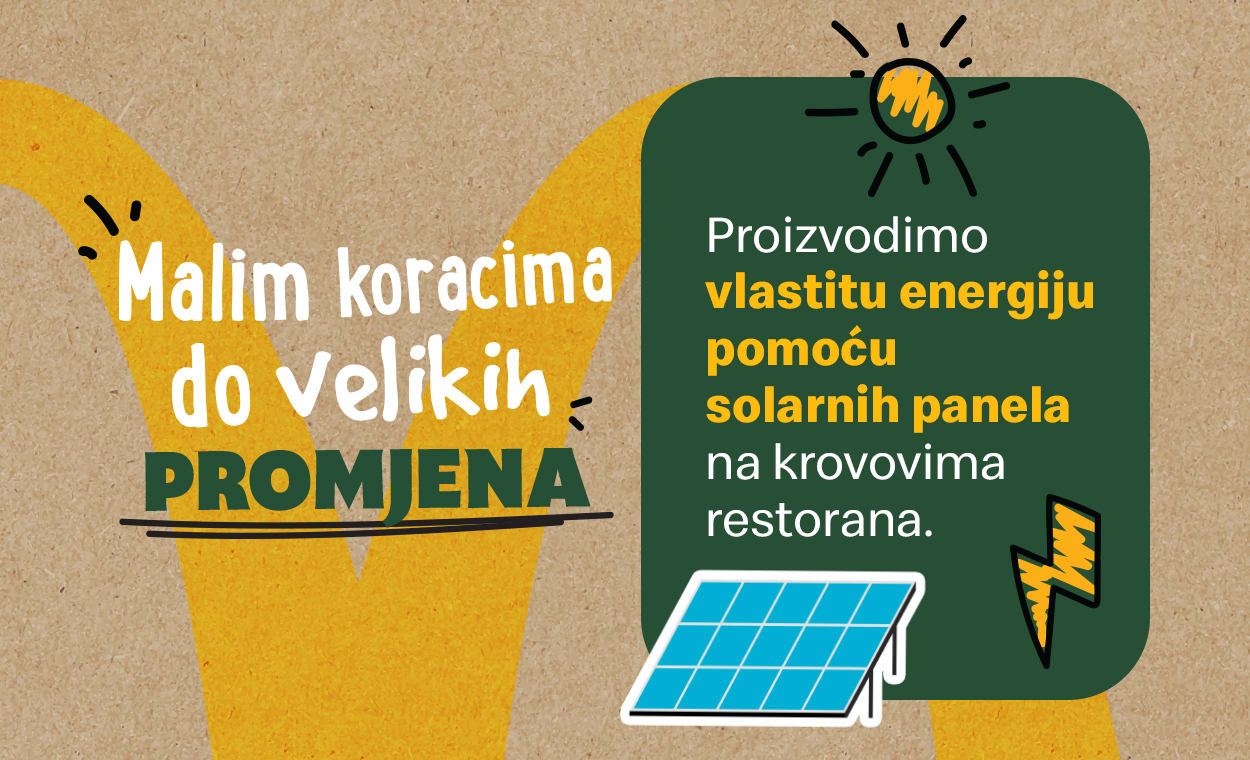 Proizvodimo svoju električnu energiju uz pomoć solarnih panela koji su postavljeni na dijelu naših restorana. Energija koju proizvodimo zadovoljava do 10% ukupne dnevne potrošnje.
