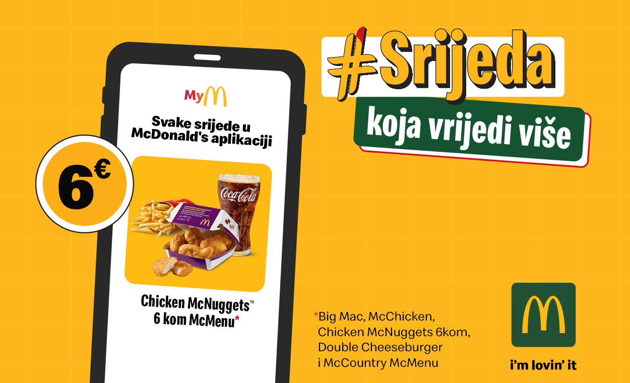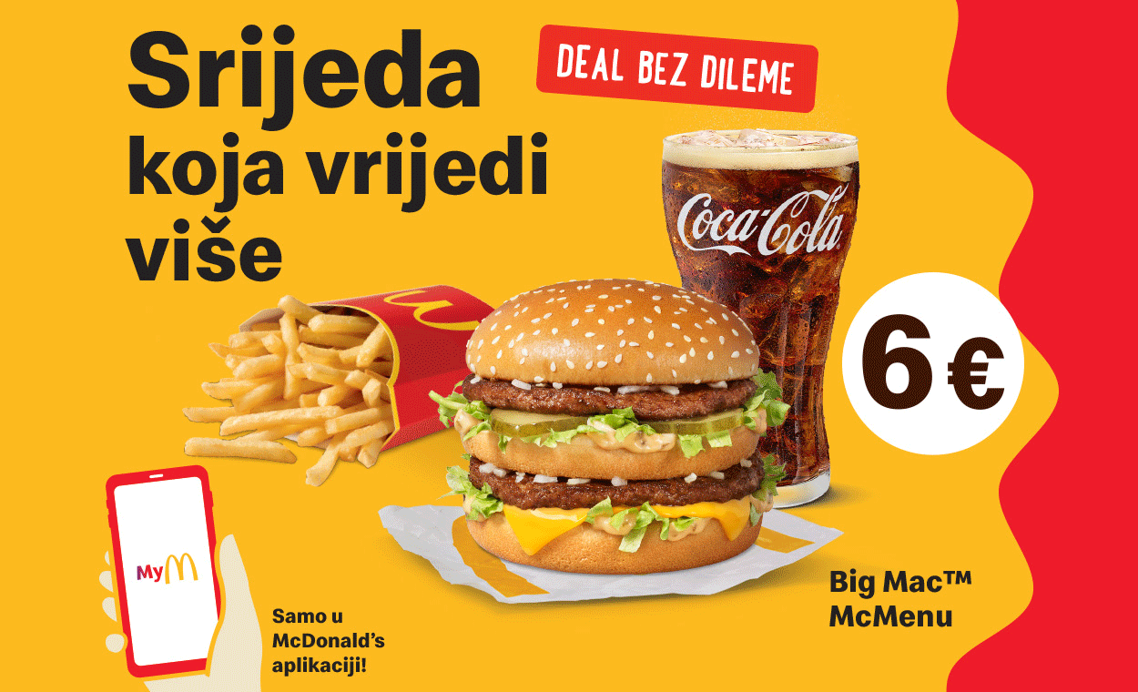 Sredina tjedna u McDonald'su upravo je postala uzbudljivija. Ako si korisnik naše McDonald's aplikacije ili ćeš tek postati, odsad ćeš svaku srijedu moći računati na McMenu po cijeni od 6 eura. Menije među kojima možeš birati, i u kojima ćeš moći uživati po spomenutoj cijeni su: Big Mac McMenu, McChicken McMenu, McNuggets McMenu 6 kom, Double Cheeseburger McMenu i McCountry McMenu. Ne zaboravi kako u sklopu bilo kojeg McMenua možeš odabrati i hrskave krumpiriće ili salatu uz jedno od osvježavajućih gaziranih pića ili pak soka od naranče ili jabuke kako bi tvoj obrok bio upotpunjen i zaokružen. Složit ćeš se da za svakoga ima ponešto i da je ovo definitivno srijeda koja u McDonald'su vrijedi više.