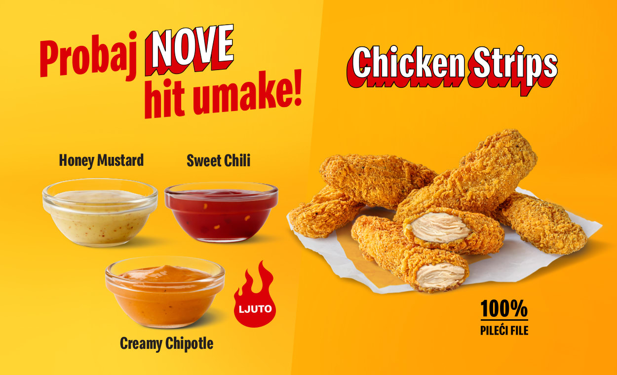 Koji god umak odabereš, savršeno će se sljubiti s Chicken Stripsima, hrskavim prutićima od 100 posto pilećeg filea, koje možeš naručiti samostalno, kao McMenu ili u sklopu Chicken boxa.