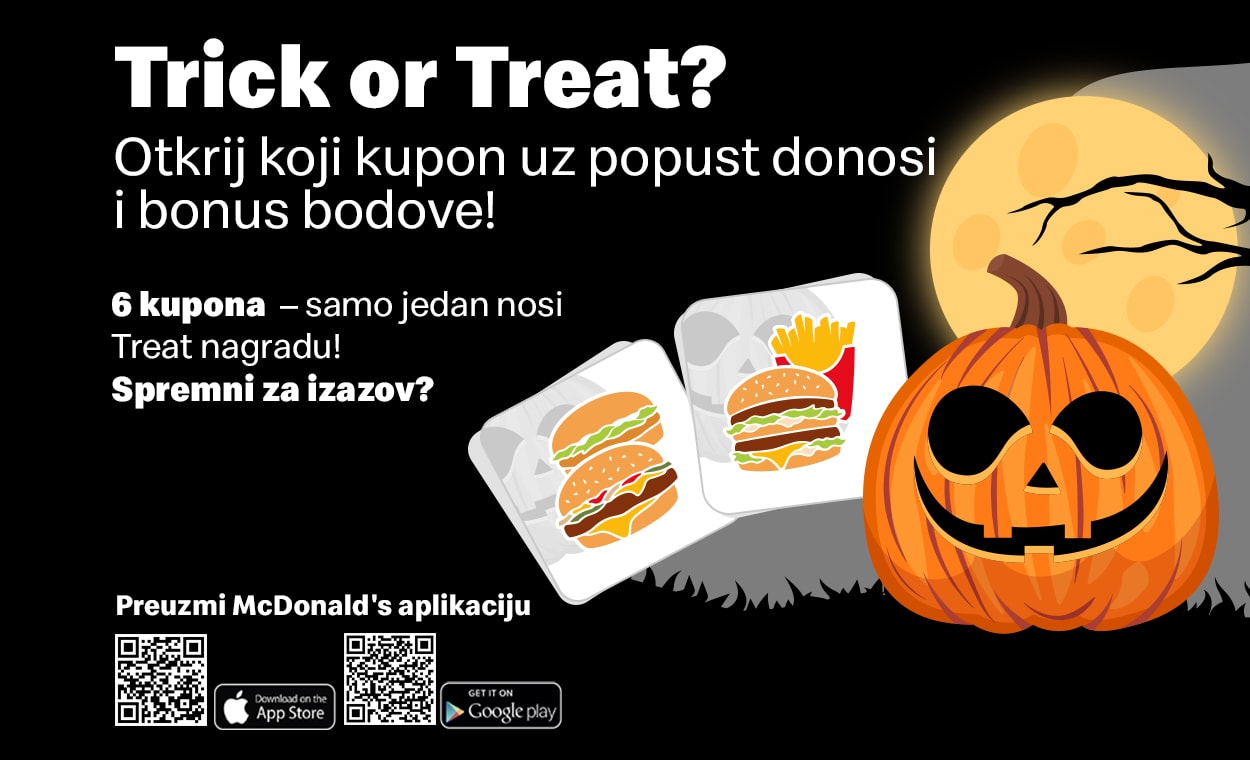 Odaberi Trick or Treat kupon za omiljene kombinacije McDonald’s zalogaja i možda ti baš taj kupon donese dodatnih 250 bodova na digitalnu karticu lojalnosti. Od ukupno šest kupona, samo jedan krije dodatne bodove. Hoćeš li ga pronaći?