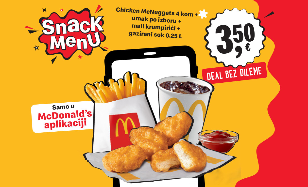 Uz pet standardnih izbora malih sendviča za Snack Menu, u aplikaciji te čeka kupon za super kombinaciju od četiri Chicken McNuggets zalogaja, umak po izboru, malo piće po izboru i male krumpiriće. Sve to samo za 3,50 eura!