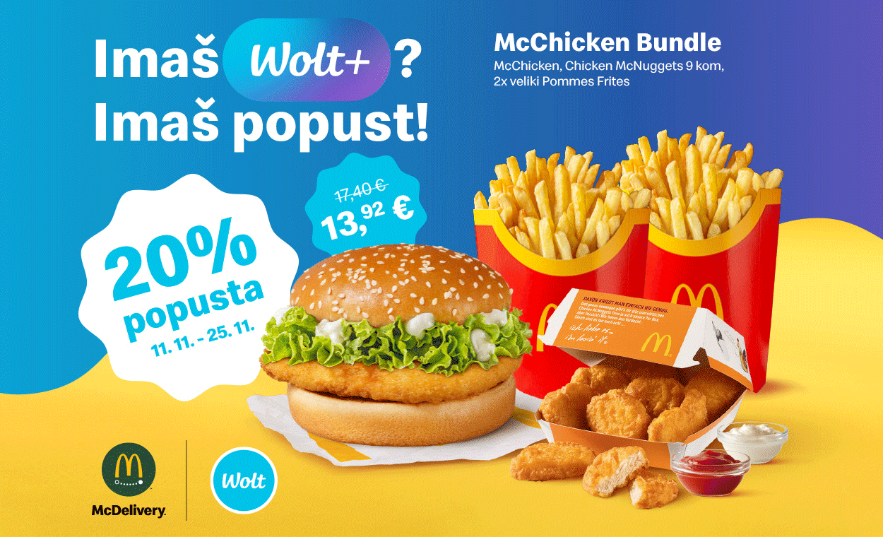 Od 11. do 25. studenog uživaj u top McDonald’s kombinacijama uz 20 % popusta, ekskluzivno u aplikaciji Wolt+.
