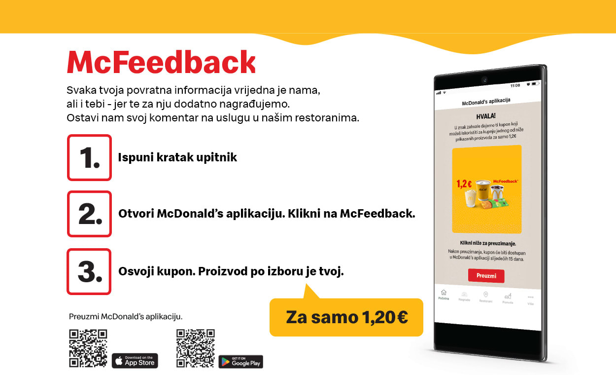 Samo jedan klik na McFeedback® unutar McDonald's aplikacije vodi te do našeg upitnika o zadovoljstvu posjetom. Skeniraj QR kod s računa i reci nam što misliš, a mi ćemo tvoj kupon zahvale spremiti s ostalim kuponima i nagradama iz našeg programa lojalnosti.